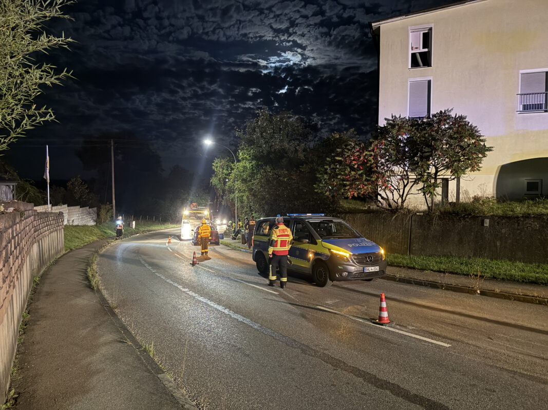 Ein PKW kollidierte mit einer Verkehrsinsel, dabei wurde die Ölwanne beschädigt. Die Unfallstelle wurde abgesichert und ausgeleuchtet. Mittels Bindemittel wurde die ca. 150 m lange Ölspur aufgenommen und die Fahrbahn gereinigt.
